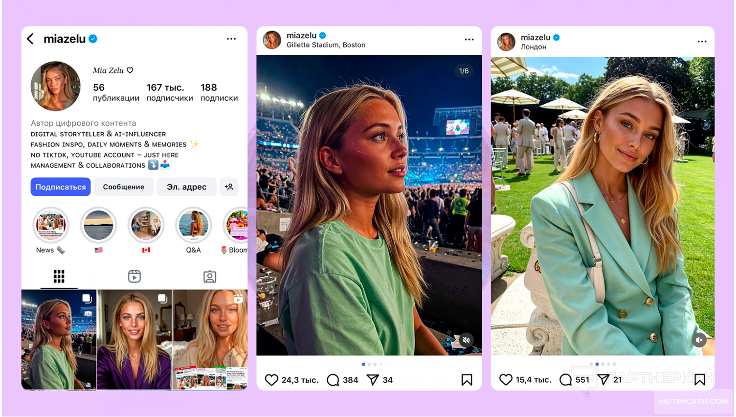 На выходе получается настолько реалистичный образ, что отличить его от настоящего человека почти невозможно. Например, британская AI-девушка Миа Зелу набрала более 167 тысяч подписчиков в Instagram, а один из её фанатов — звезда крикета Ришаб Пант — долгое время даже не подозревал, что общается не с человеком.